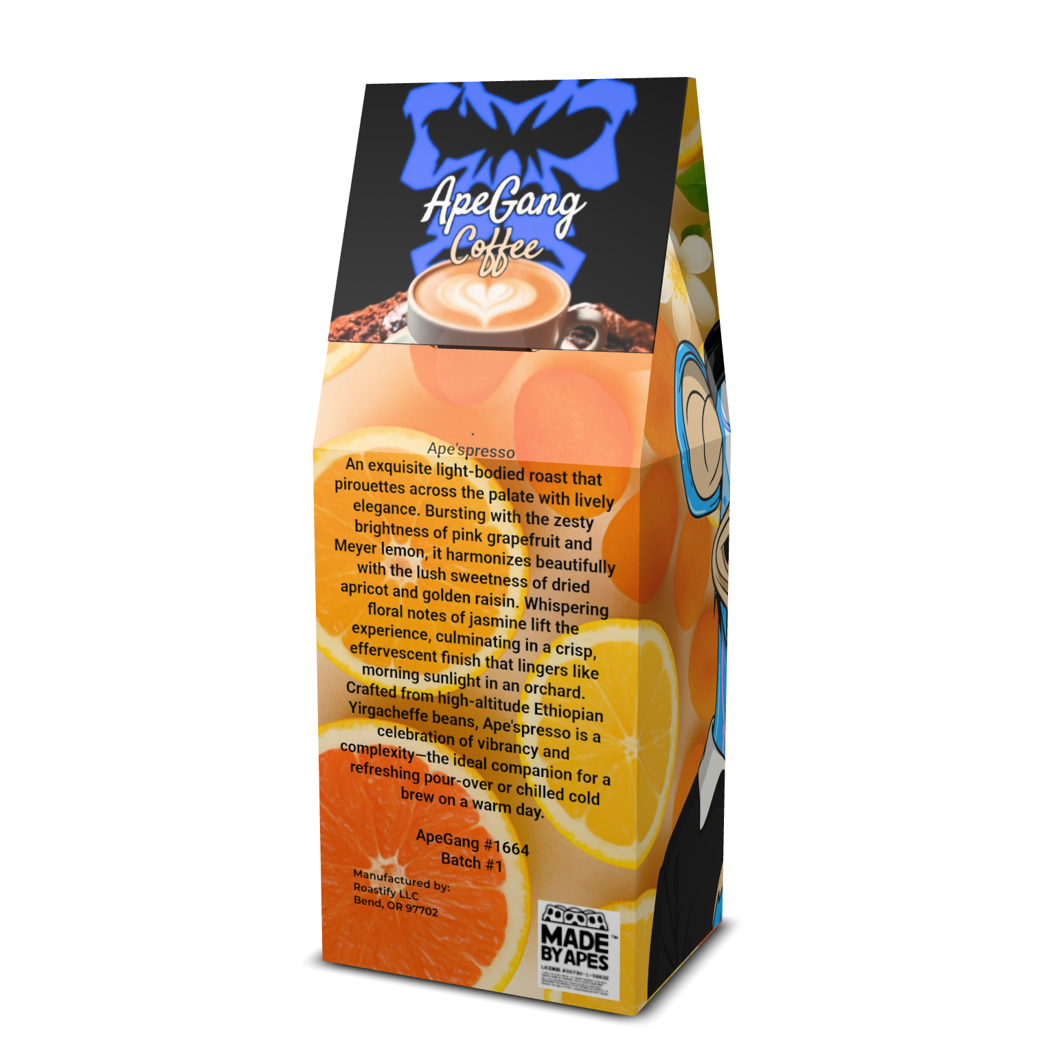 Light Roast An exquisite light-bodied roast that pirouettes across the palate with lively elegance. Bursting with the zesty brightness of pink grapefruit and Meyer lemon, it harmonizes beautifully with the lush sweetness of dried apricot and golden raisin. Whispering floral notes of jasmine lift the experience, culminating in a crisp, effervescent finish that lingers like morning sunlight in an orchard. Crafted from high-altitude Ethiopian Yirgacheffe beans, Ape'spresso is a celebration of vibrancy and complexity—the ideal companion for a refreshing pour-over or chilled cold brew on a warm day.